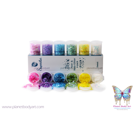 Le Superstar Chunky Glitter contient un mélange de paillettes fines, moyennes et plus grandes en polyéthylène téréphtalate de qualité cosmétique. En mélangeant ces tailles, ces paillettes ont un aspect très festif et spectaculaire sur la peau.